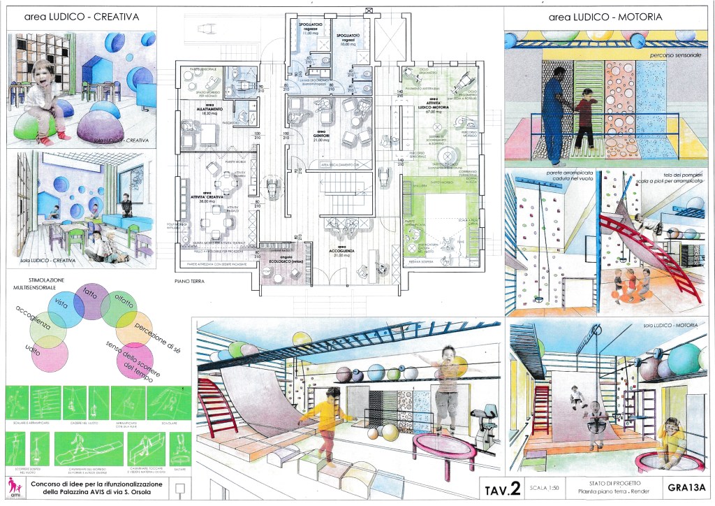 l bando del concorso di idee, aveva come obiettivo la realizzazione di un Centro ludico motorio dedicato a bambini e adolescenti con diverse tipologie di disabilità, aperto ai familiari, amici e alla cittadinanza.